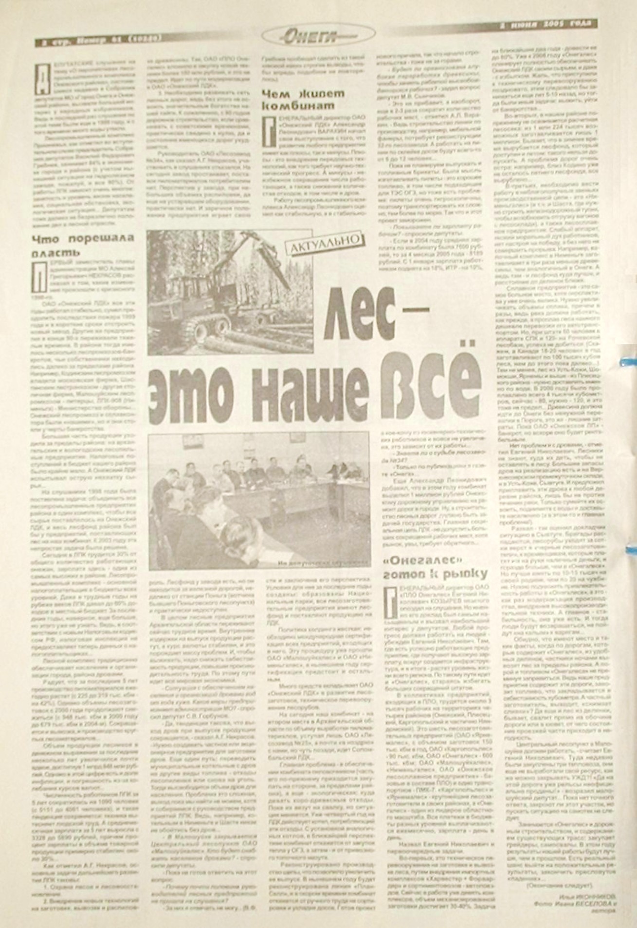 «Лес — это наше всё». Материал был опубликован в онежской районной газете «Онега», номер за 1 июня 2005 года.