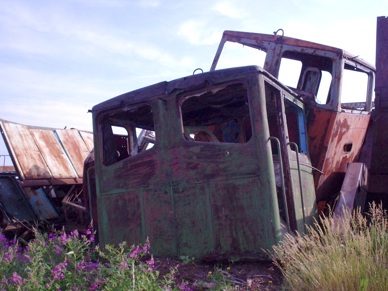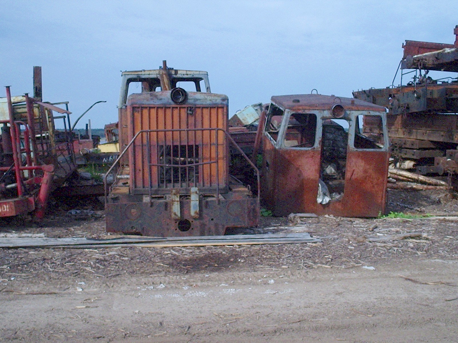 Кабины тепловозов и другой подвижной состав на нижнем складе.