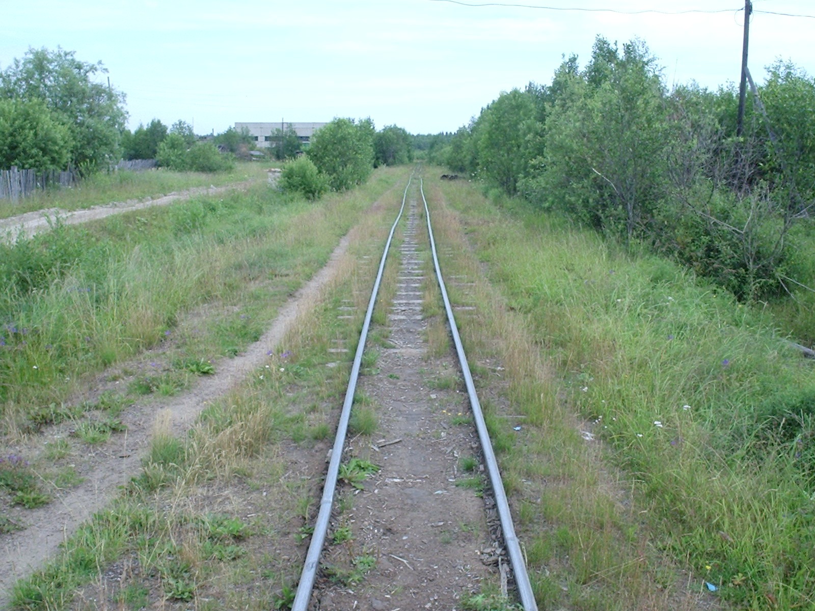 Впереди — пересечение с автодорогой Усть-Ваеньга — Сплавной. Вид в сторону главной станции.