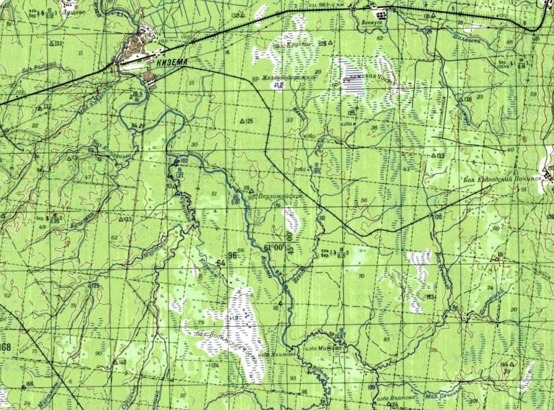 Узкоколейная железная дорога на топографической карте масштаба 1:100 000, изданной в 199? году.