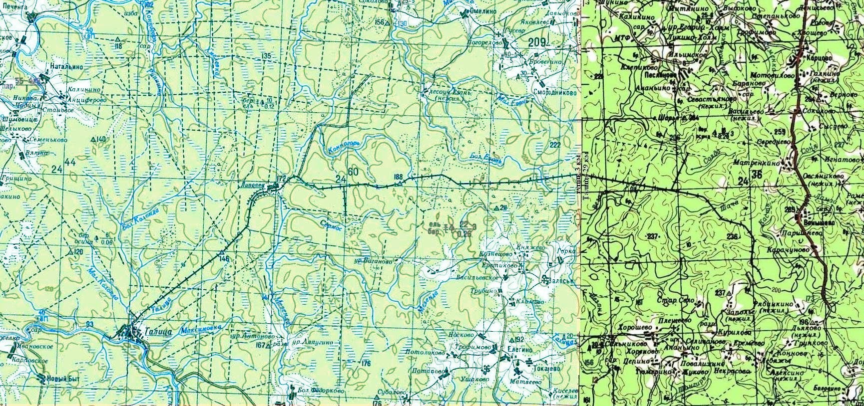 Узкоколейная железная дорога на топографической карте масштаба 1:200 000. «Левый» фрагмент относится к карте,