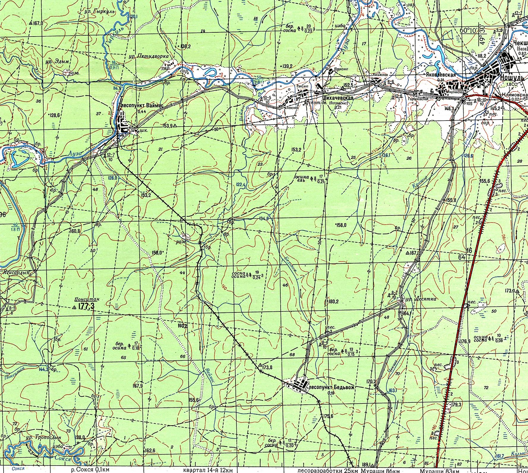 Узкоколейная железная дорога на топографической карте масштаба 1:100 000, изданной в 1987 году (показана не полностью).