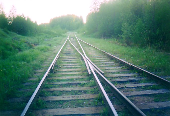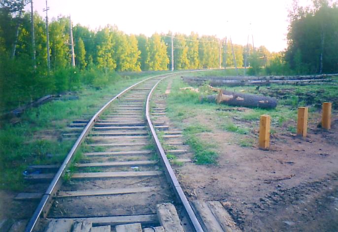 Подъездной путь вступил в пределы посёлка Нименьга. Вид в сторону нижнего склада.