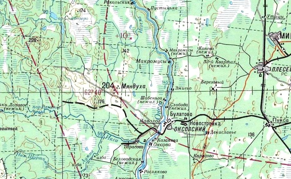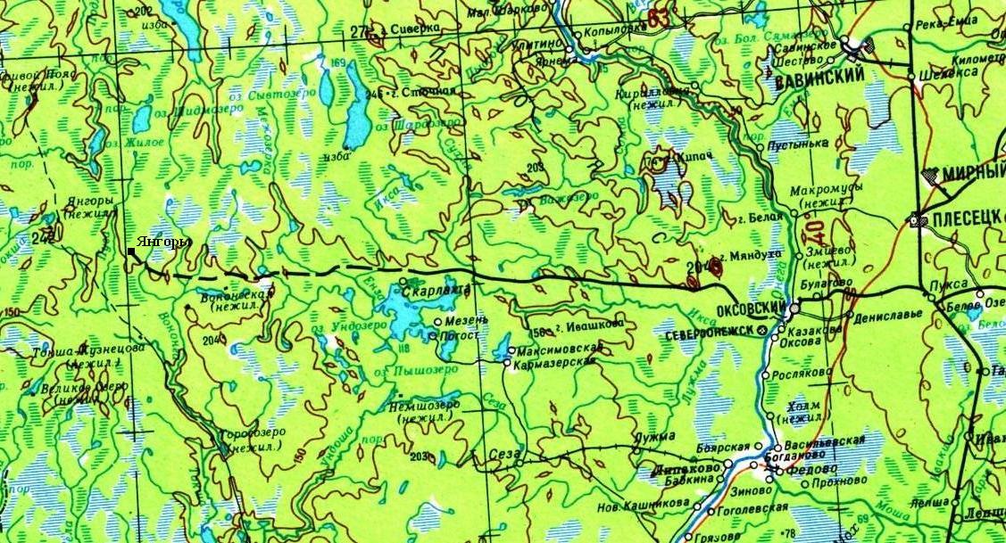 Заонежская железная дорога на топографической карте масштаба 1:200 000 (перегон Наволок — Икса, окрестности посёлка Североонежск).