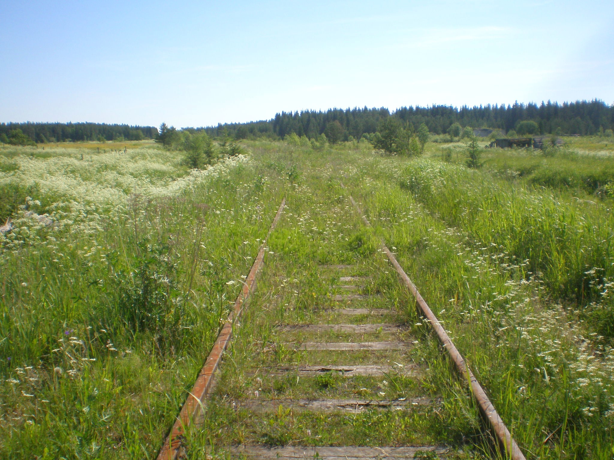 Вид в направлении Пуксоозеро. 500-метровый участок сохранившихся путей закончился, с этого места впереди