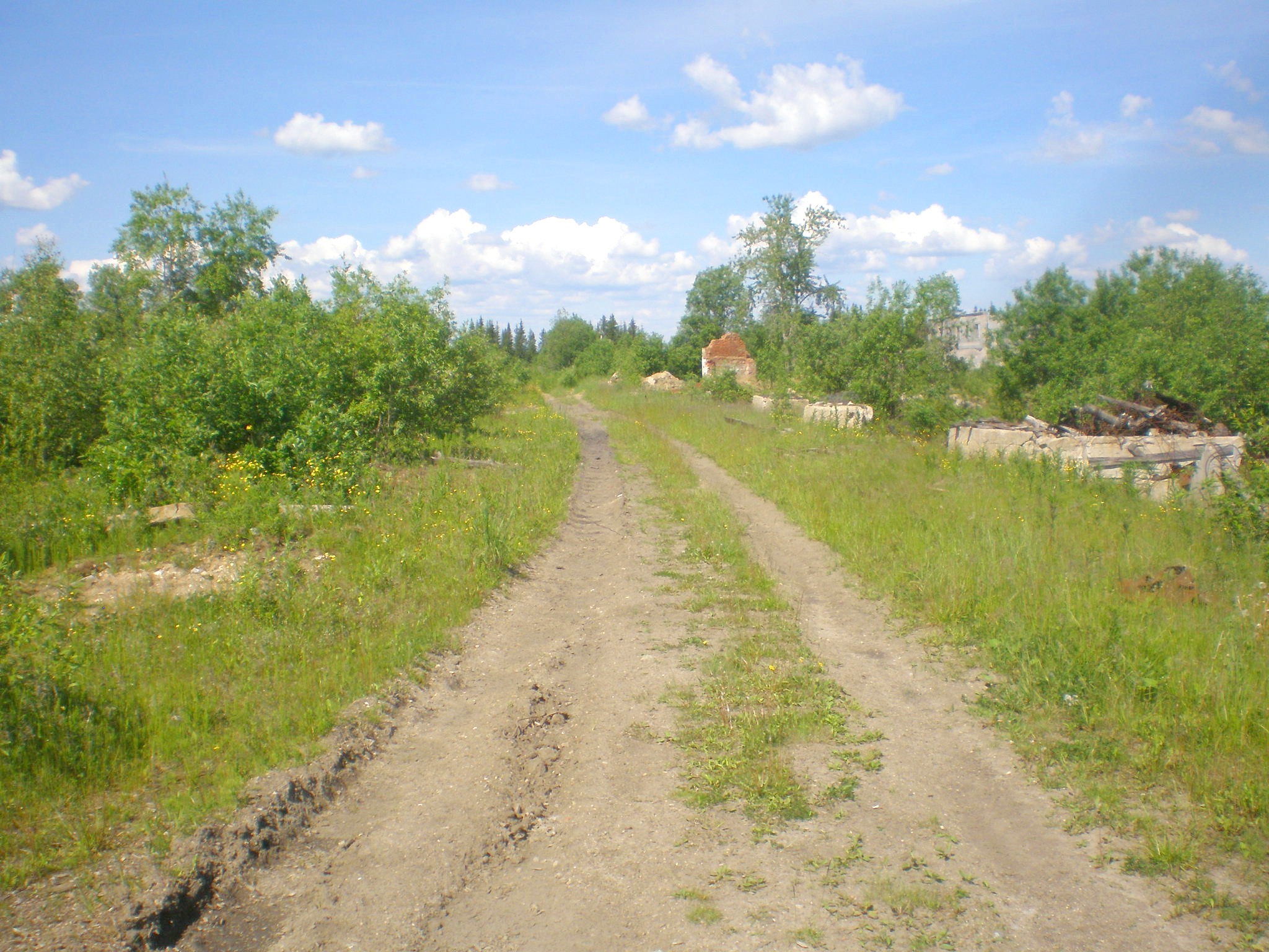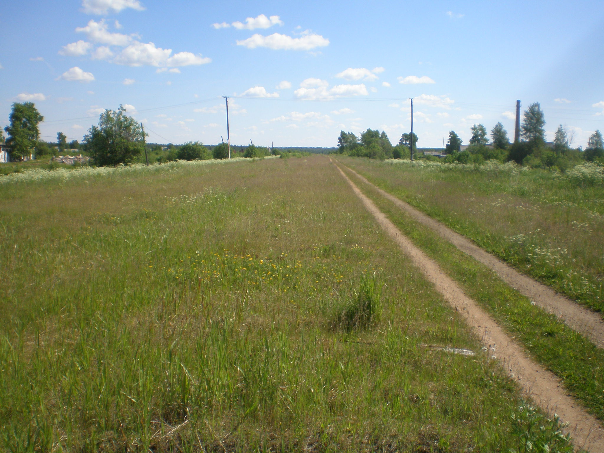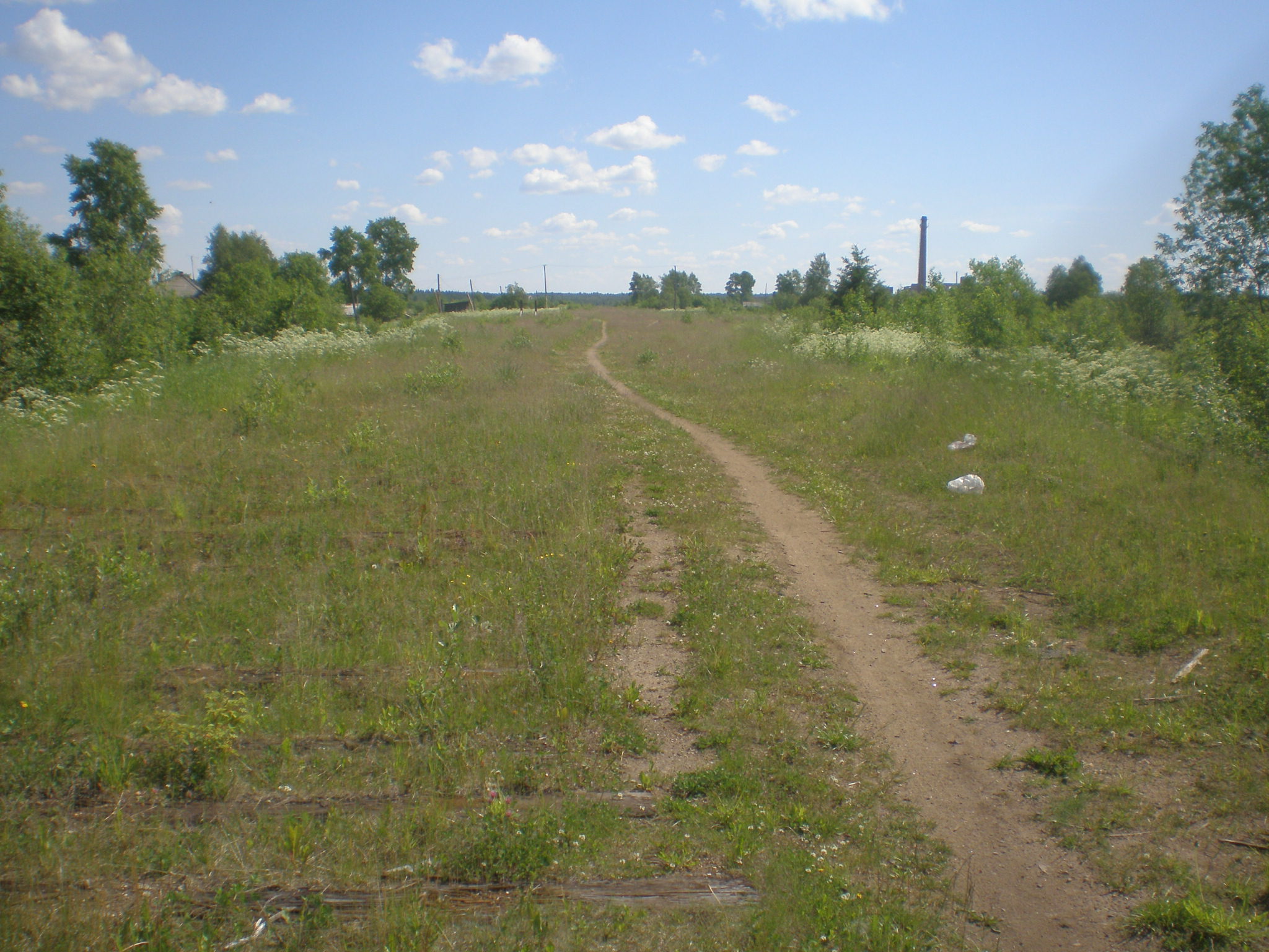 Бывшая станция Пуксоозеро. Вид в восточном направлении. Справа вдали — труба бывшего целлюлозного завода.