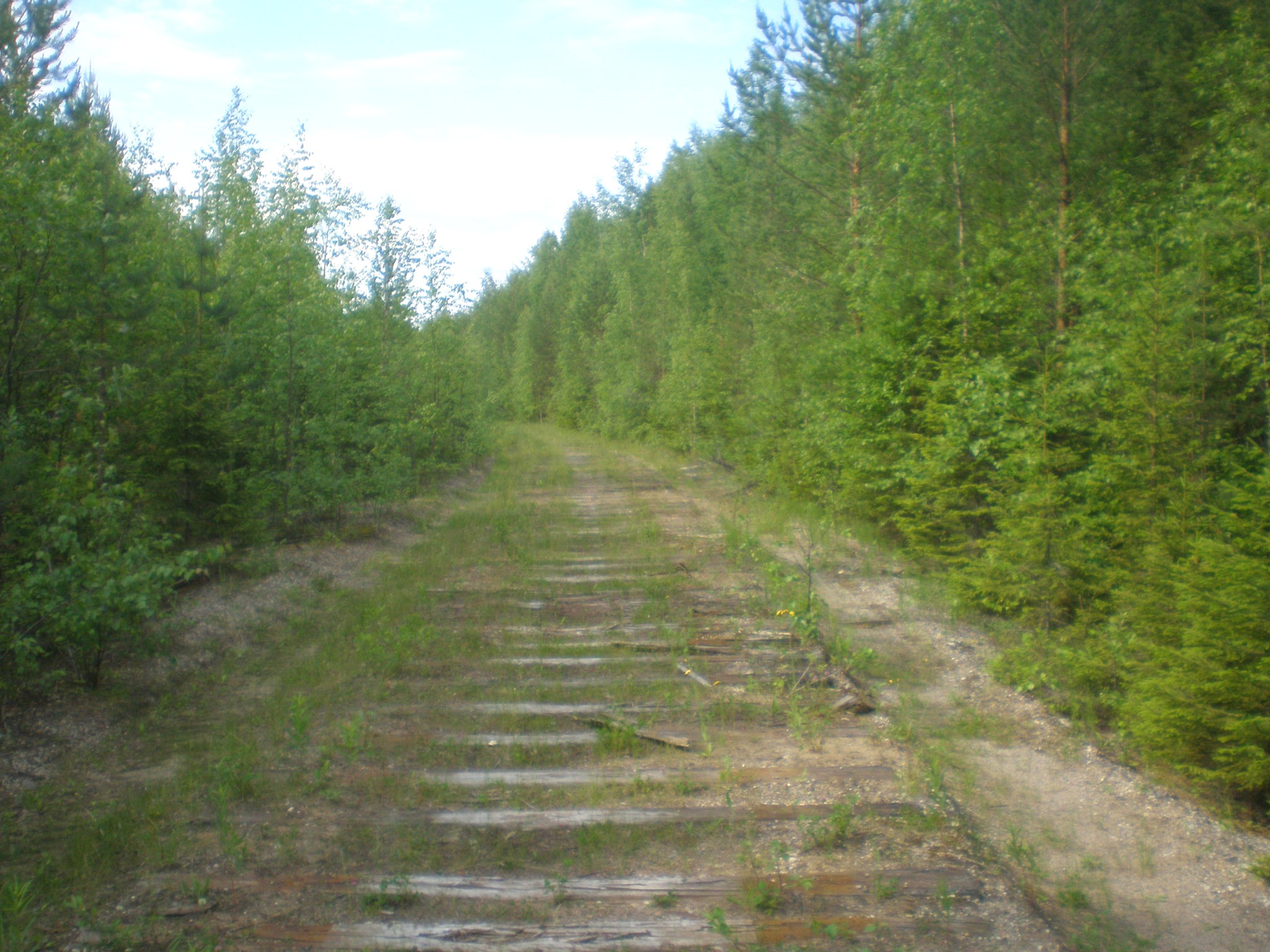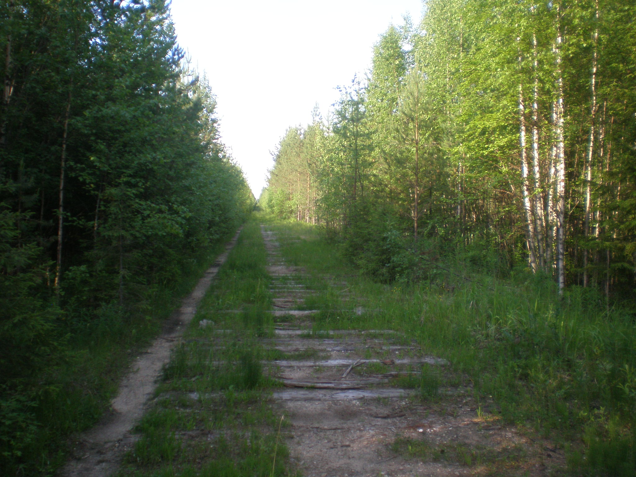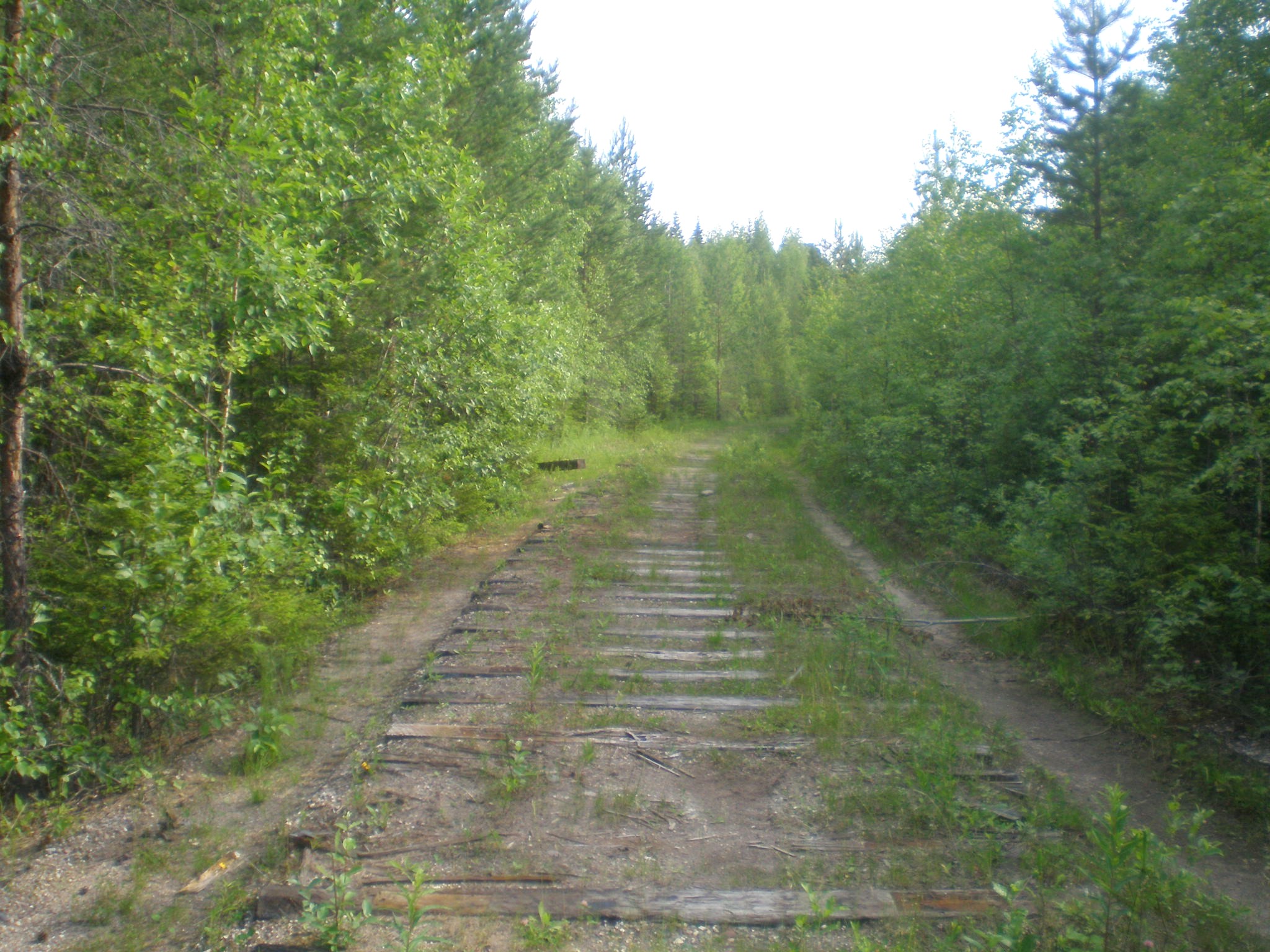 Перегон Зимняя — Дальняя. Вид в восточном направлении. Справа — километровый знак, заброшенный на дерево.