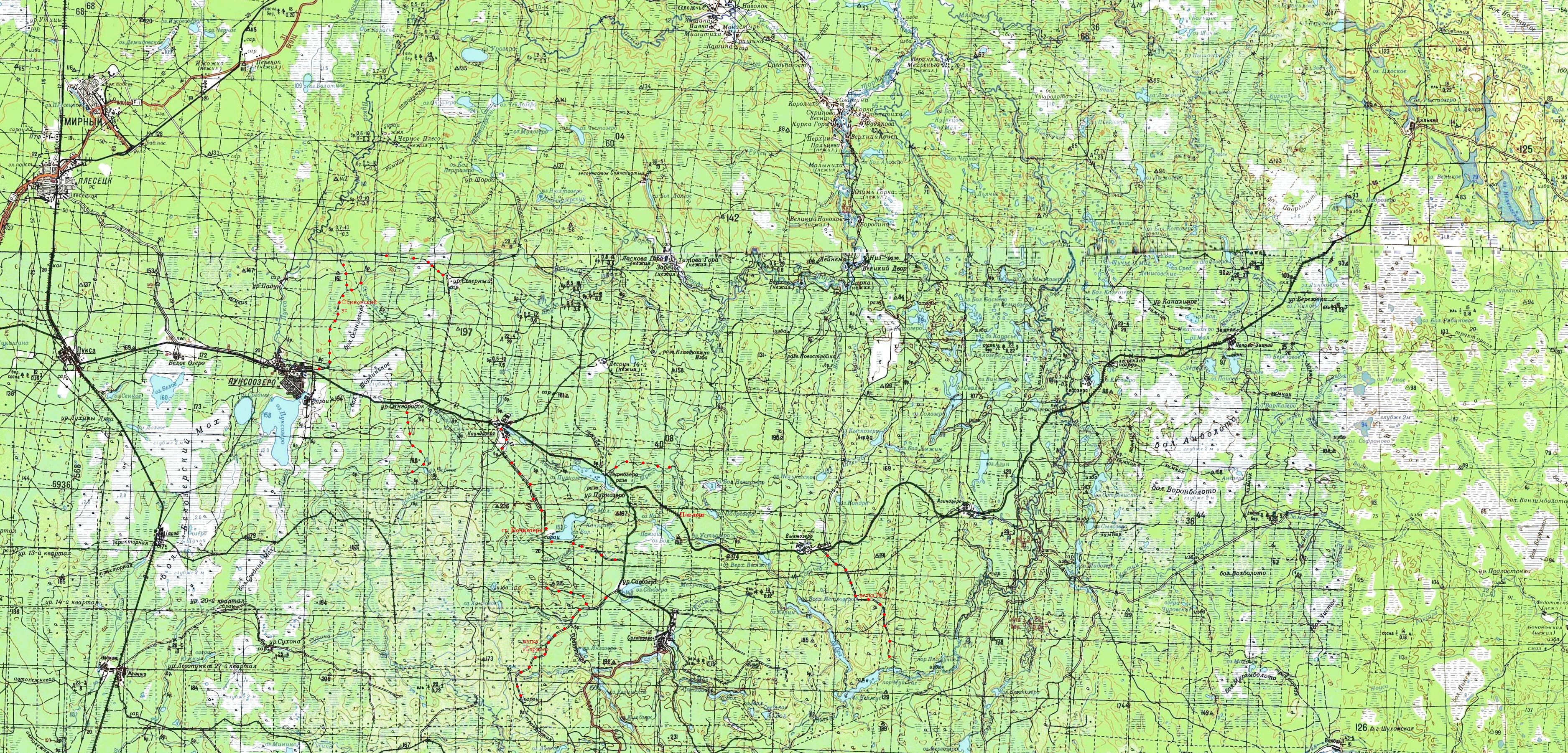 Мехреньгская железная дорога на топографической карте масштаба 1:500 000, изданной в 1990 году.