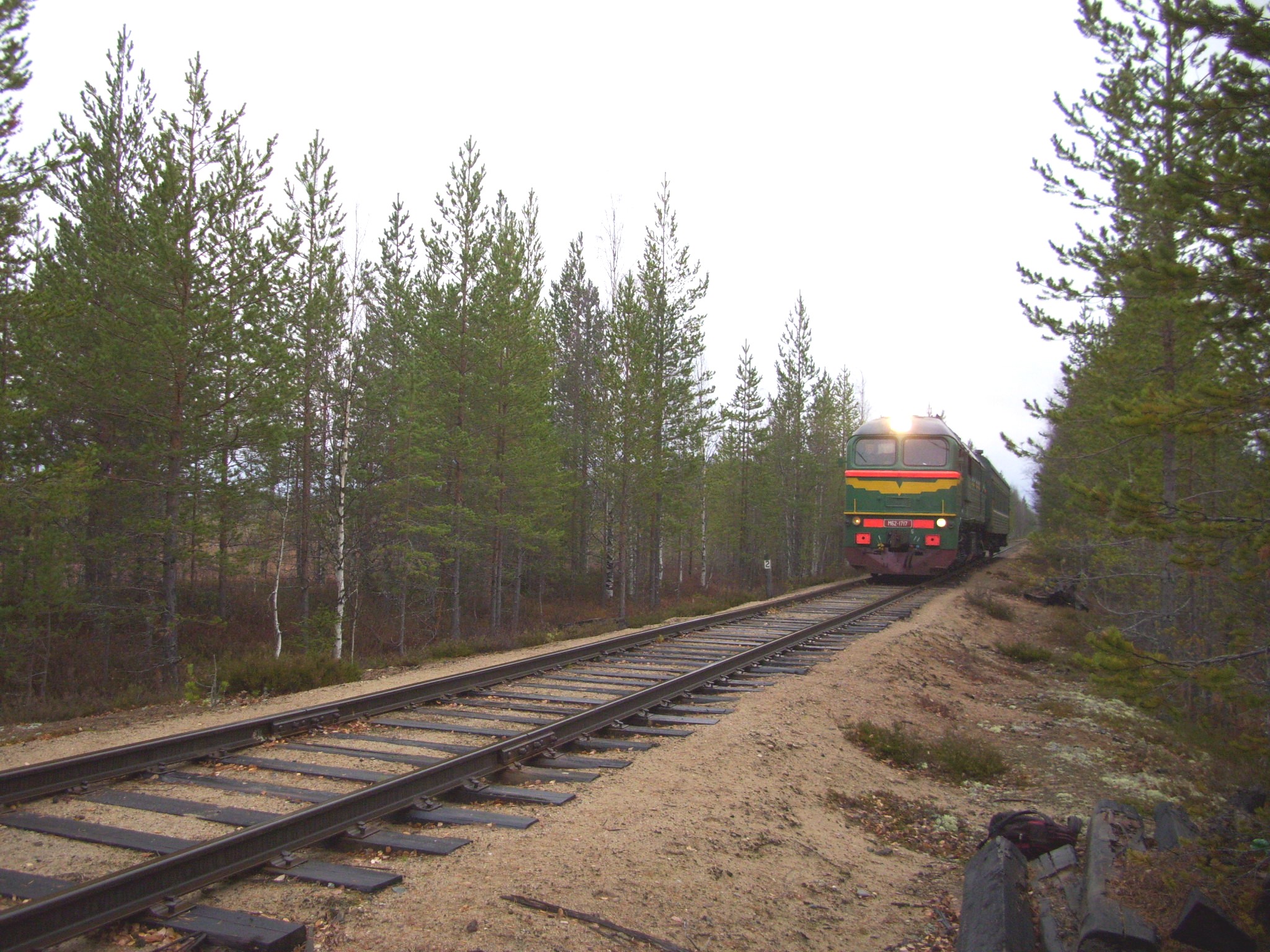 Поезд ведёт тепловоз М62-1717. Построен в Луганске в 1976 году, приписан к ТЧ-26 Кемь. Время 11:41.