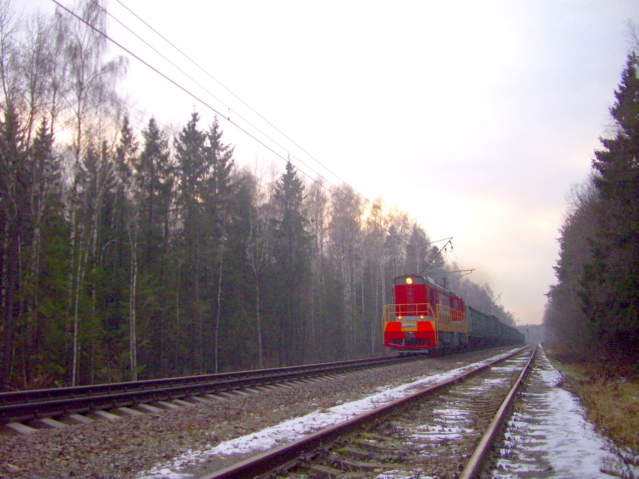 Перегон Стройка — Горенки. Вид в сторону Стройки. Тепловоз ЧМЭ3-6234 с грузовым поездом на главном пути.