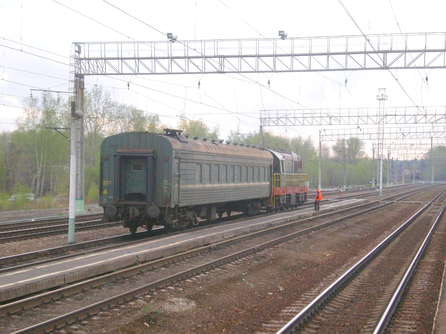 Пригородный поезд из Рязановки прибыл на станцию Кривандино. Вид с высокой платформы в юго-западном направлении.