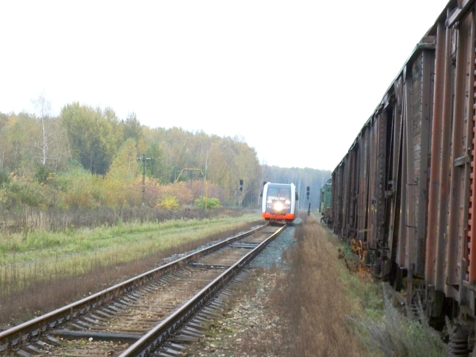 Вид от платформы станции Сазоново в южном направлении. Прибывает автомотриса