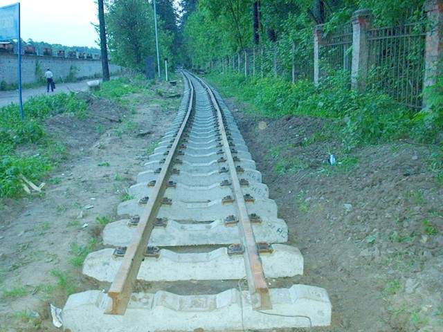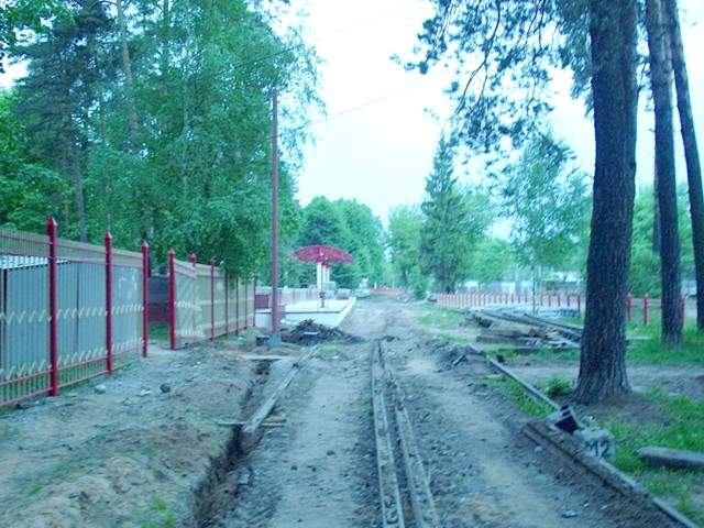 Впереди — тупик узкоколейной железной дороги. Вид в западном направлении.