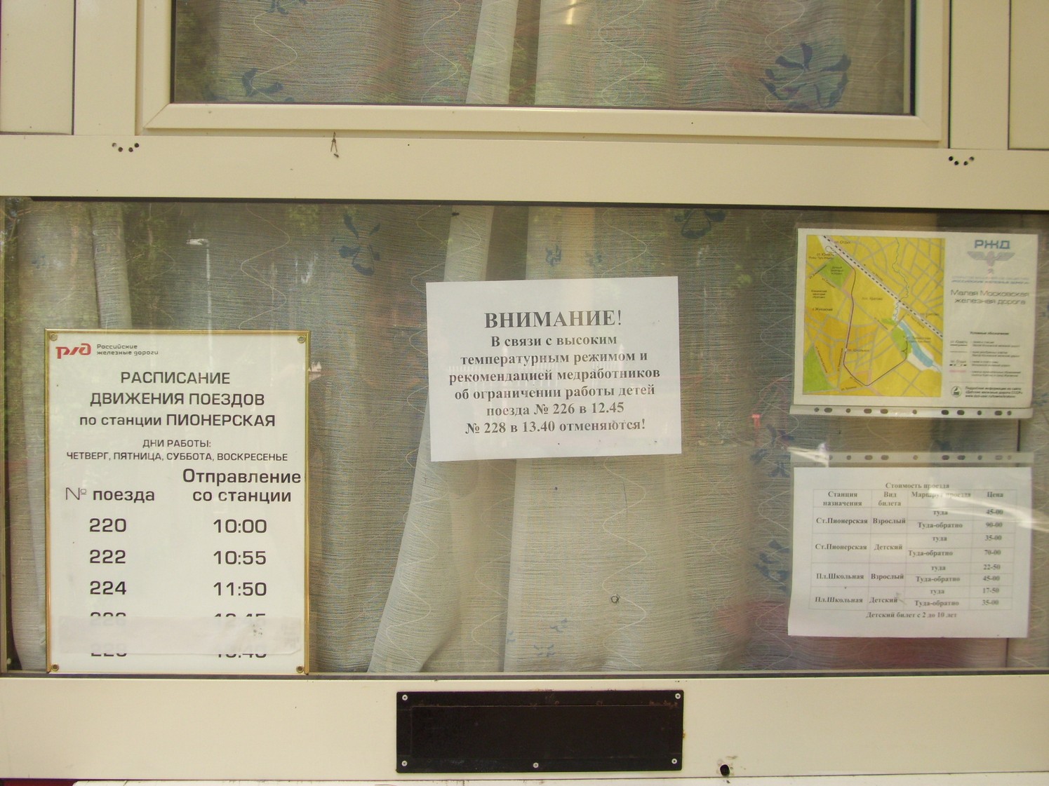 Расписание движения поездов и объявления у кассы на станции Пионерская.