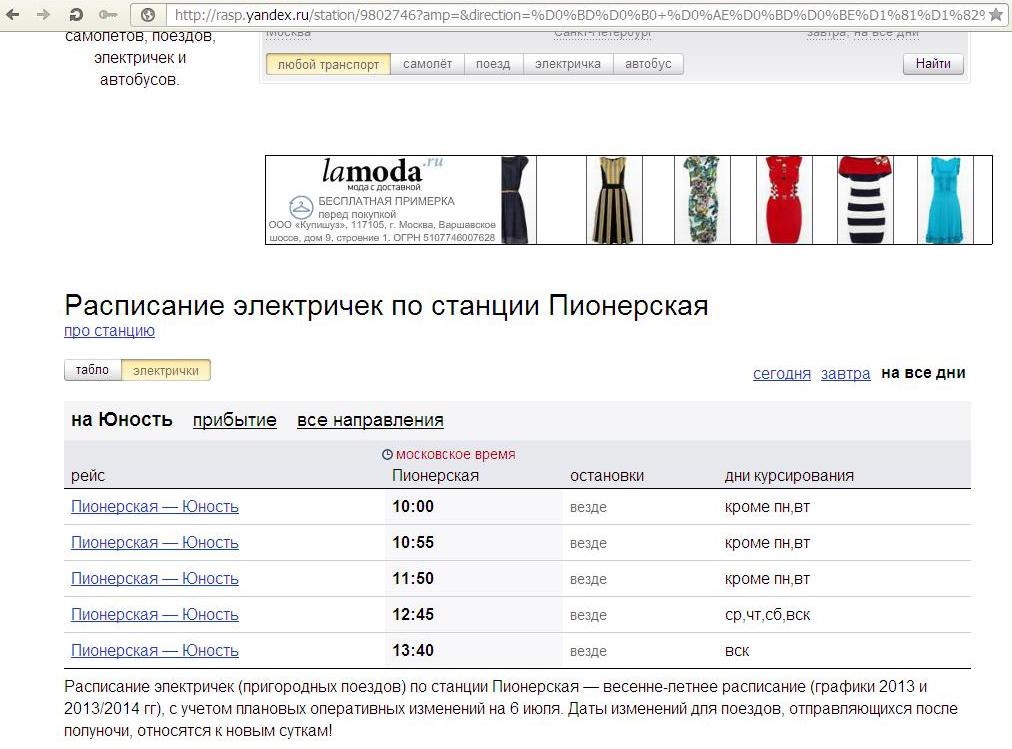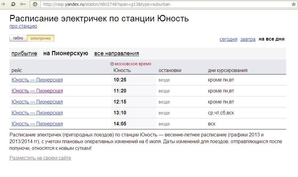 Расписание движения поездов по станции Пионерская на сервере «Яндекс-Расписания». 2013 год.