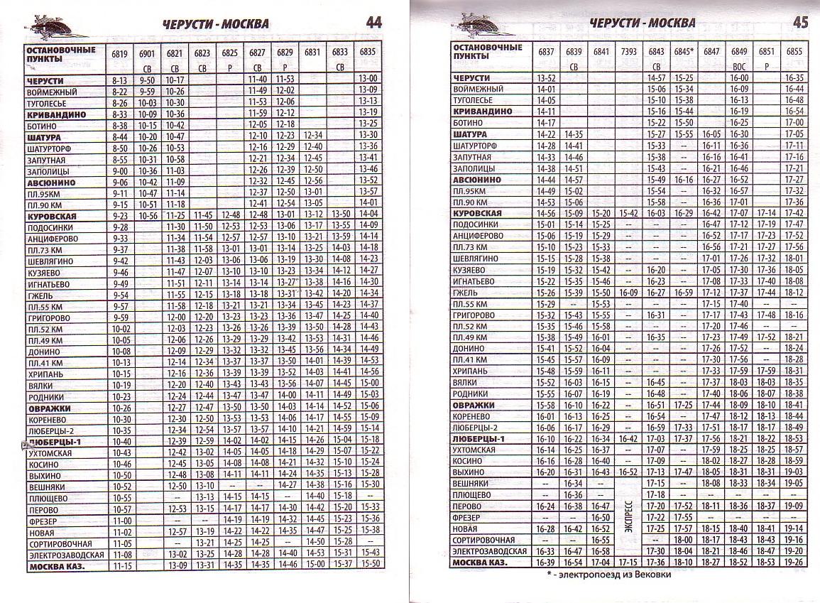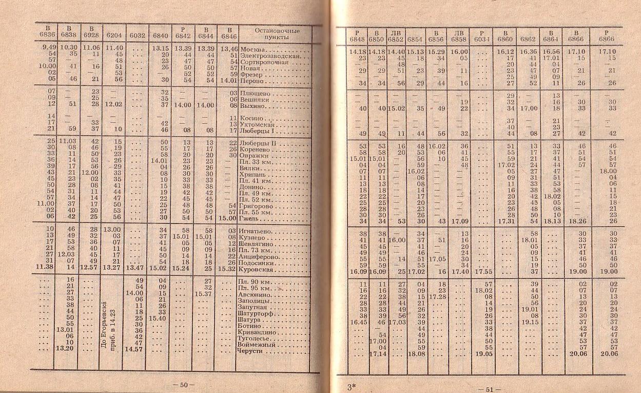 Расписание движения пригородных поездов (график 1991/1992 гг., из сборника расписаний для пассажиров).