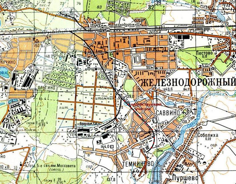 1985 году (восточная часть). Выделен недействующий участок до Саввинской мануфактуры.