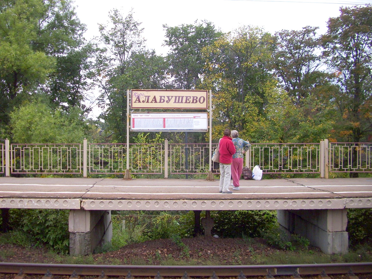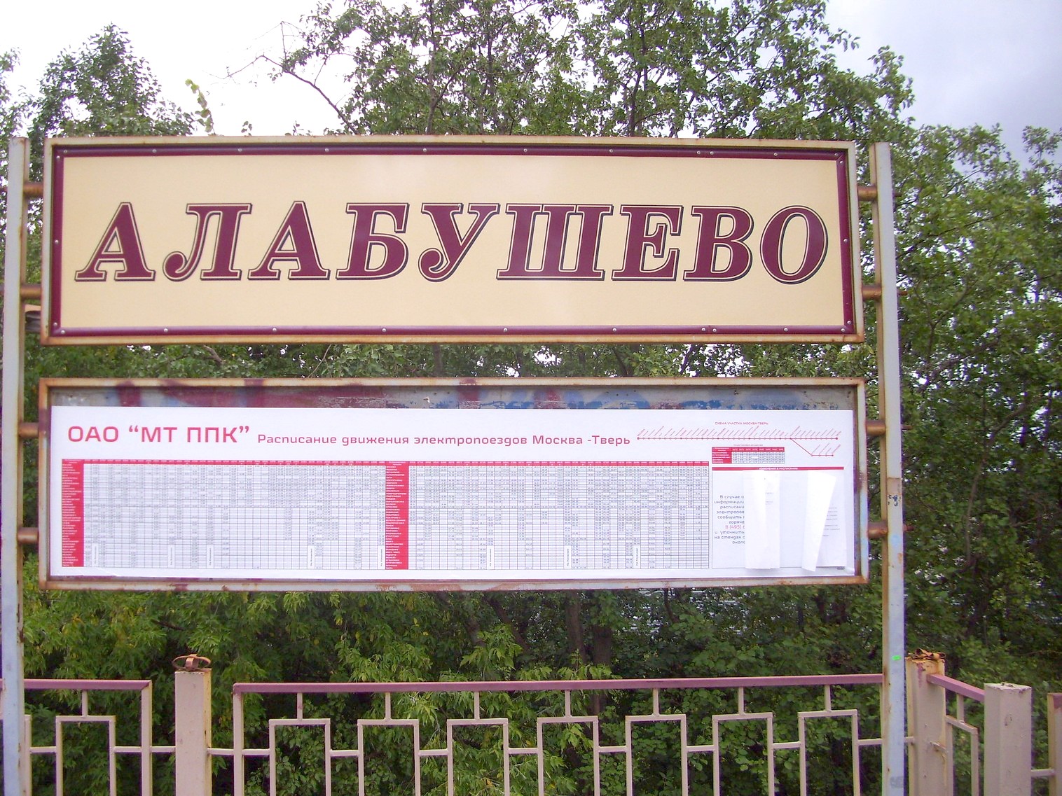 Платформа (остановочный пункт) Алабушево находится на 607 километре Петербурго-Московской железной дороги (расстояние до Москвы — 42 километра). Согласно справочнику «Железнодорожные станции СССР», изданному в 1981 году, платформа была открыта в 1932 году.