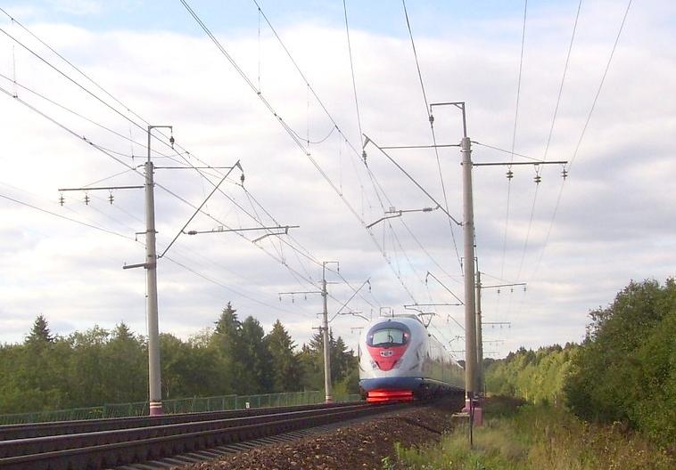 Линия в том же месте. Электропоезд ЭВС1 «Сапсан», следующий по маршруту