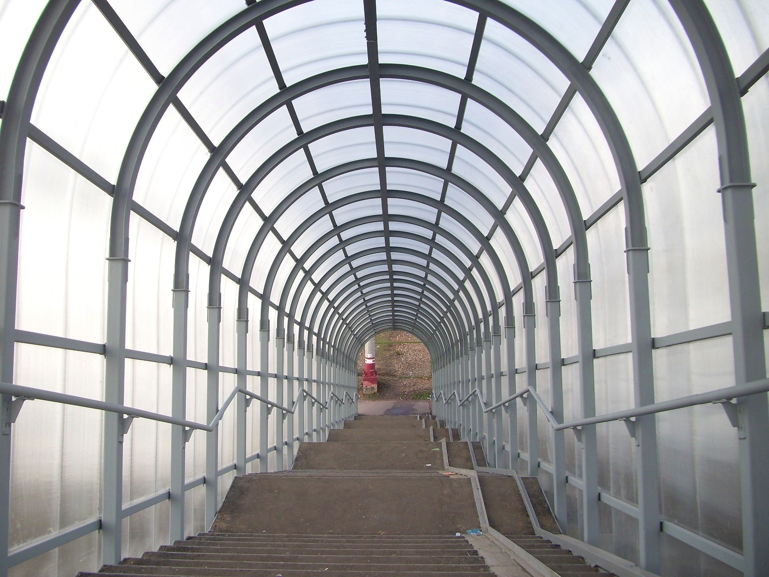 Крытый пешеходный мост. Вид сквозь дыру в стеклопластике в северном направлении.
