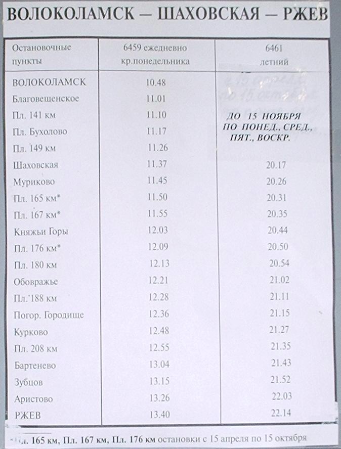 Расписание движения поездов сообщением Волоколамск — Ржев и Шаховская — Ржев,