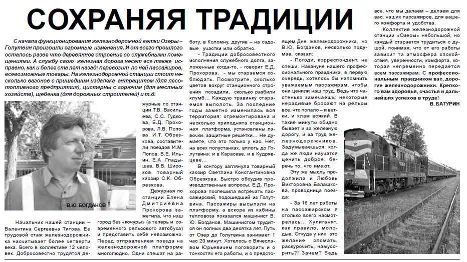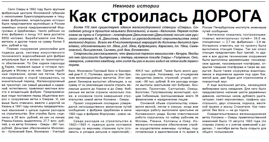 ЖЕЛЕЗНОДОРОЖНАЯ ЛИНИЯ ГОЛУТВИН — ОЗЁРЫ МАТЕРИАЛЫ СРЕДСТВ МАССОВОЙ ИНФОРМАЦИИ