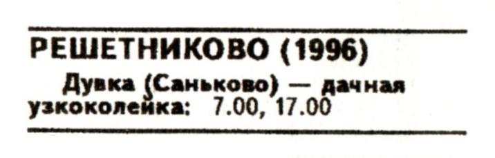 Станция Торфяная неправильно указана как «Решетниково», а станция Саньково — как «Дувка».