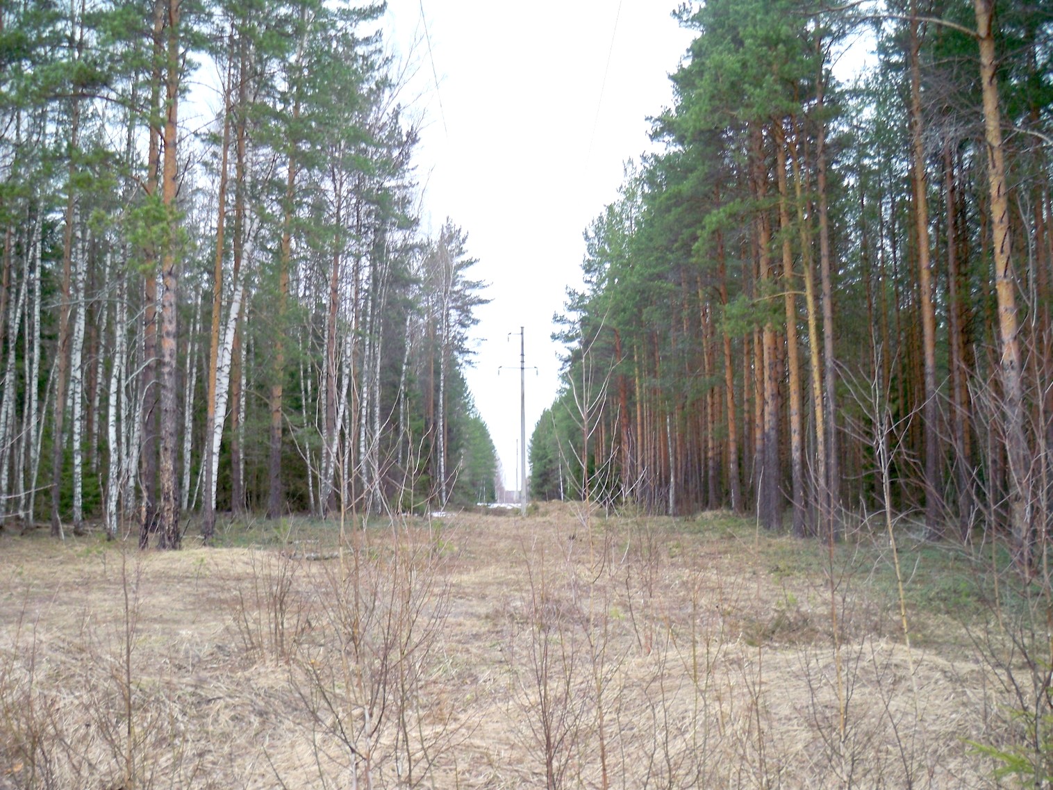 Линия электропередачи, пересекающая разобранную узкоколейную железную дорогу. Вид на север.