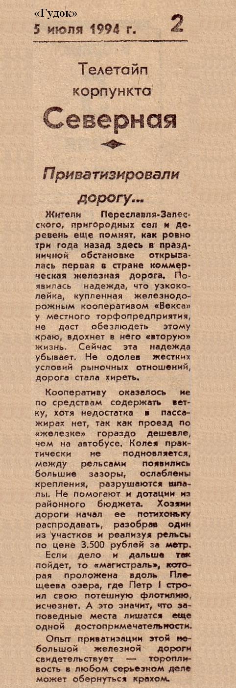 «Приватизировали дорогу...» («Гудок», 1994 год).