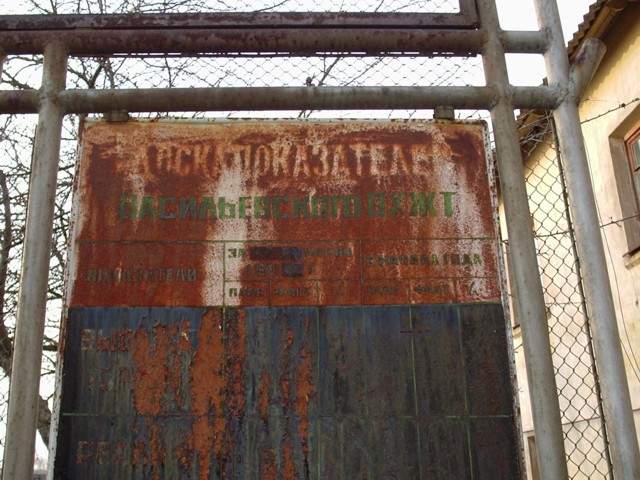 Выцветшая «Доска показателей Васильевского ОХЖТ» вблизи входа