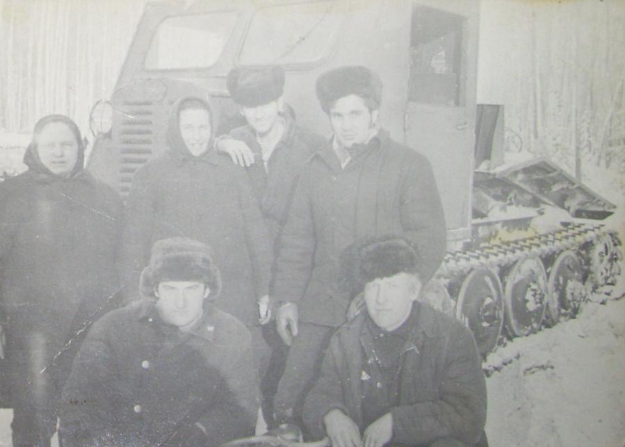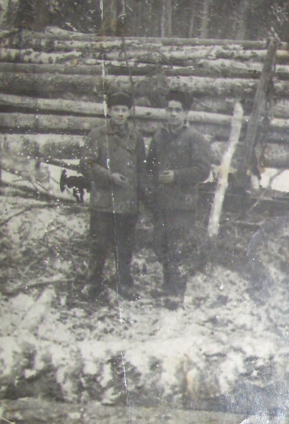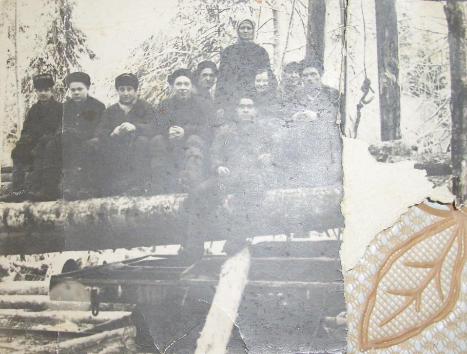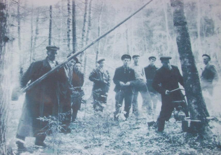 Группа лесозаготовителей в лесу. По состоянию на 2012 год, фотография находилась