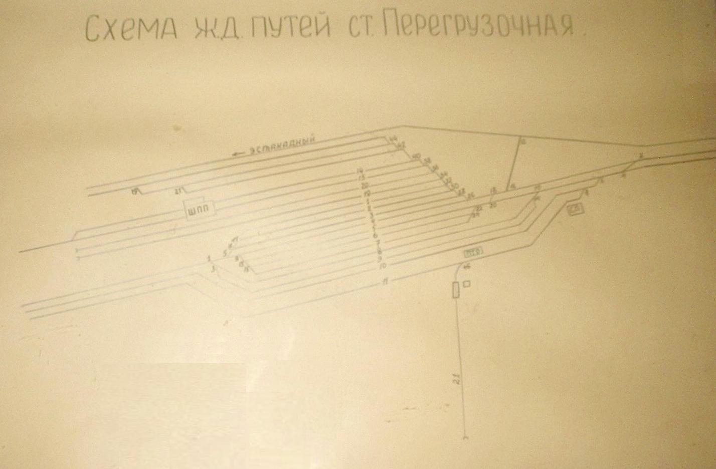 «Схема путей станции Перегрузочная». Изображение было сделано 20 апреля 2006 года на станции Перегрузочная.