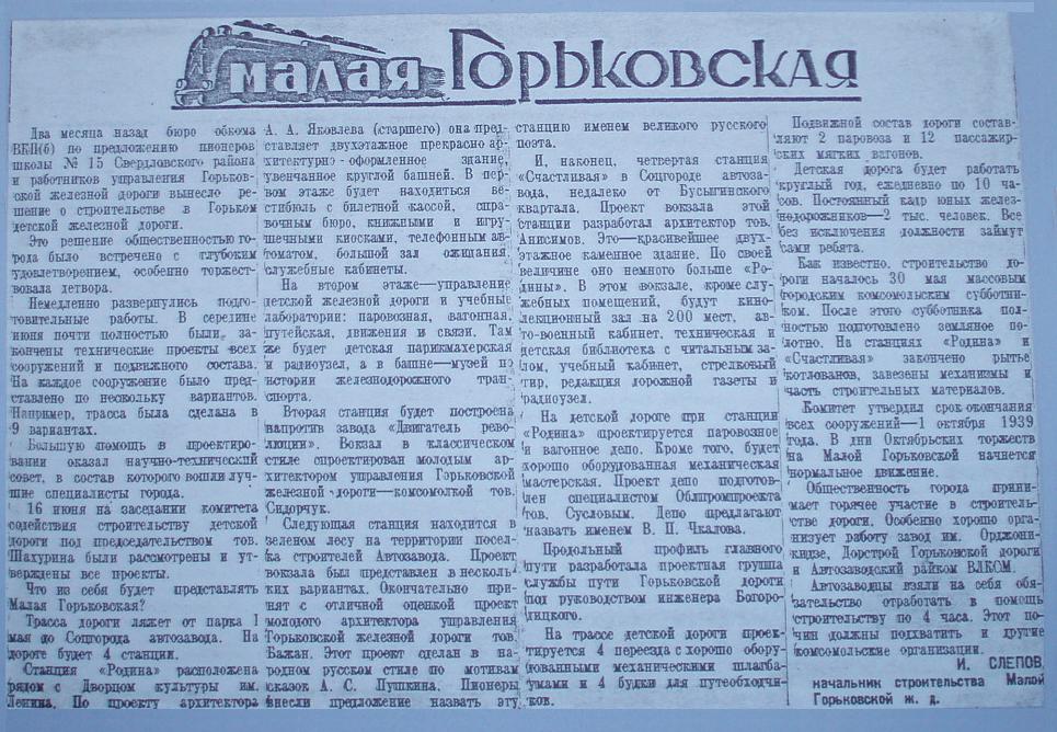 МАЛАЯ ГОРЬКОВСКАЯ (НИЖЕГОРОДСКАЯ) ДЕТСКАЯ ЖЕЛЕЗНАЯ ДОРОГА МАТЕРИАЛЫ СРЕДСТВ МАССОВОЙ ИНФОРМАЦИИ