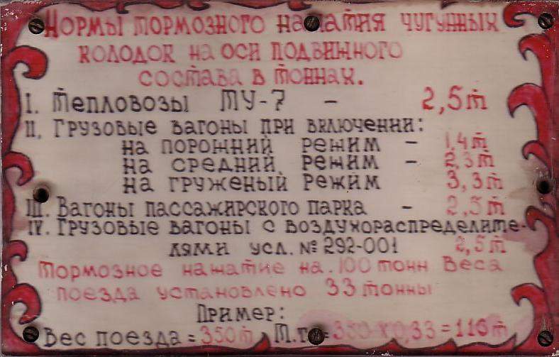 Табличка, находившаяся в тепловозе ТУ7А-2890 (о нормах тормозного нажатия чугунных колодок на оси подвижного состава).