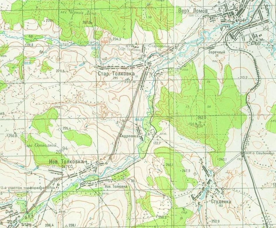 Узкоколейная железная дорога на топографической карте масштаба 1:100 000, изданной в 1982 году.