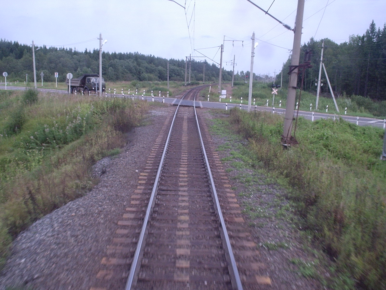 Автомобильный переезд (пересечение с автодорогой Любим — Ярославль) на перегоне Любим — Жарок. Вид в восточном направлении.