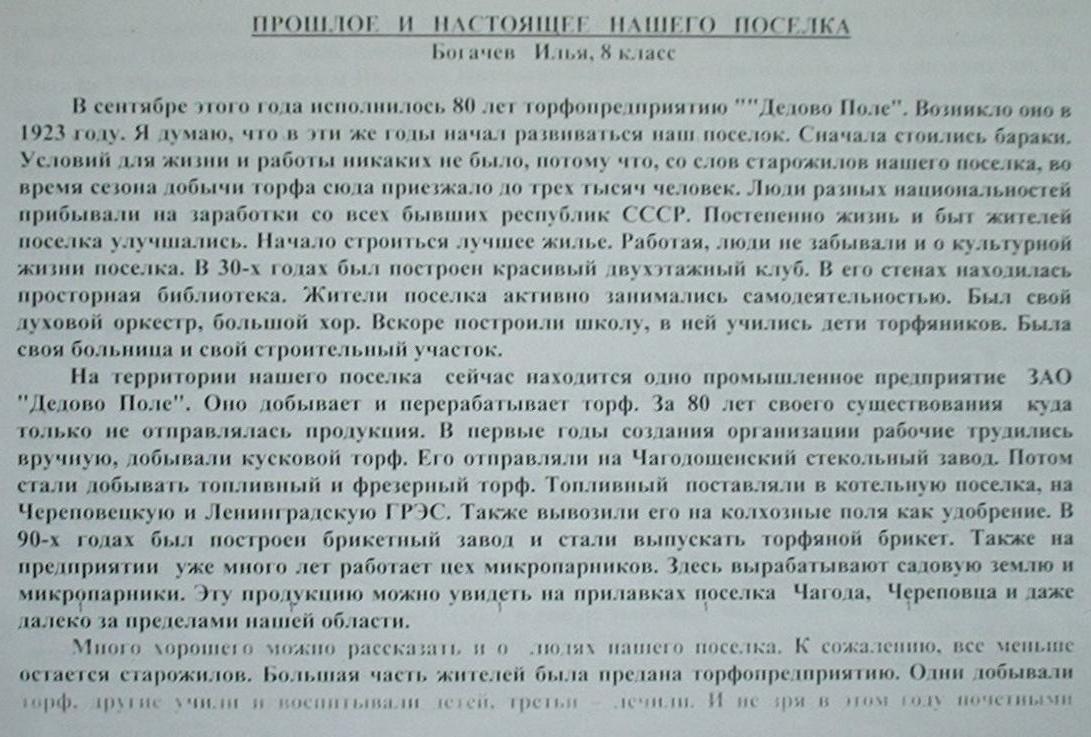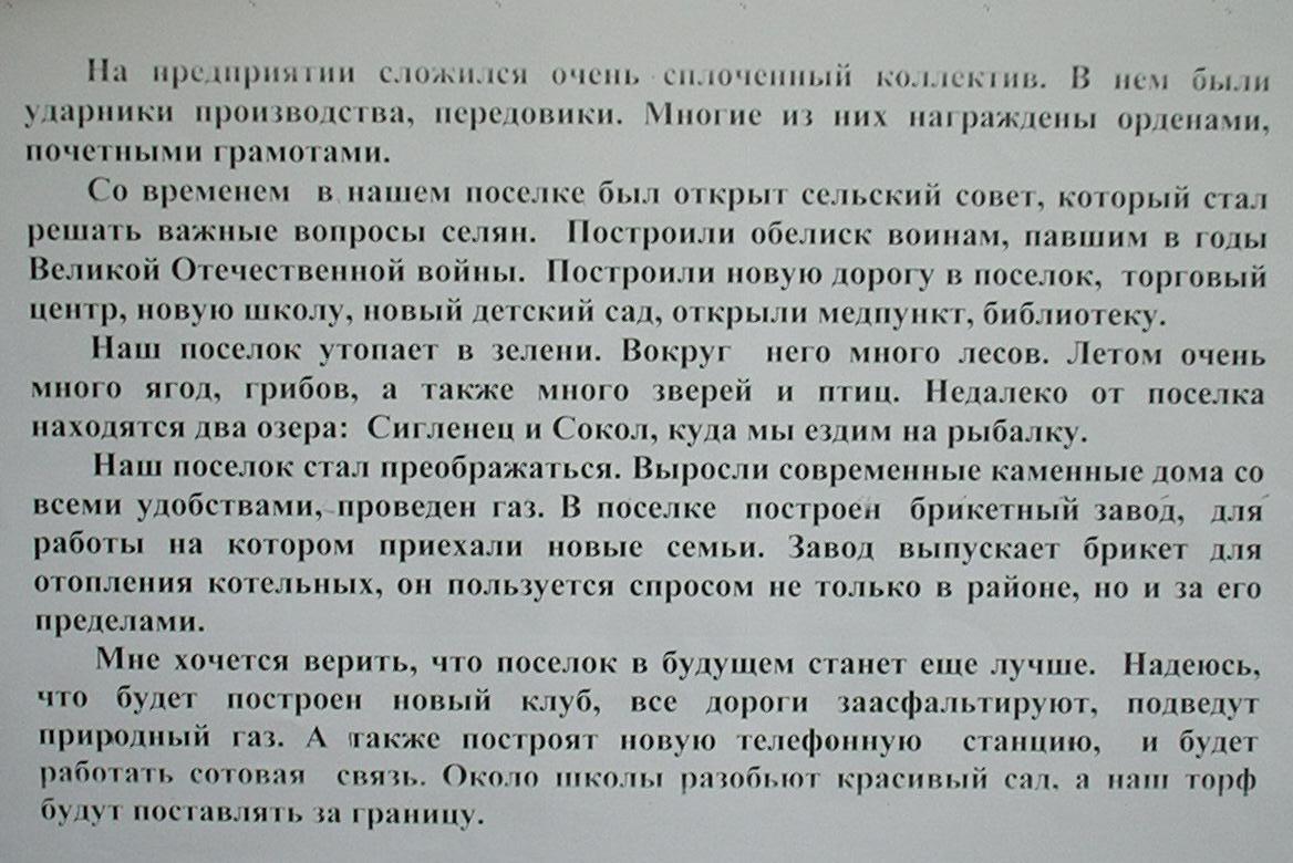 Представлены сочинения учащихся школы посёлка Борисово по теме истории торфопредприятия и посёлка. Оригиналы находятся в библиотеке посёлка Борисово.