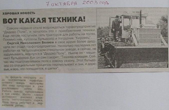 «Вот какая техника!» (материал из чагодощенской районной газеты «Искра», 07.10.2003 года).
