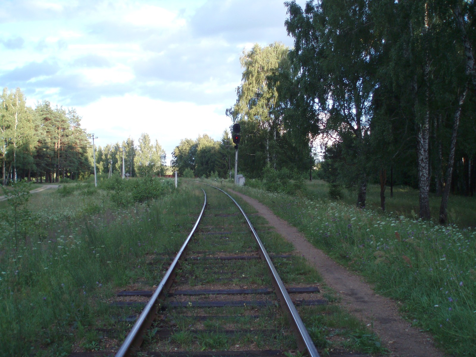 Вид из той же точки в противоположном направлении. Впереди — входной светофор станции Ильино.
