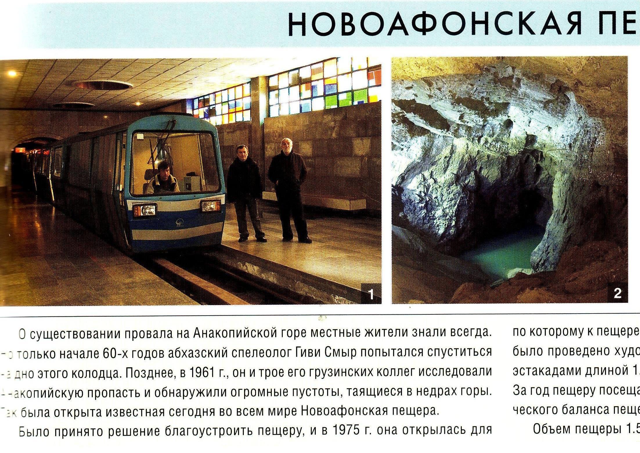 Фотографии из брошюры «Абхазия», посвящённые Новоафонской пещере. На первой фотографии — электропоезд