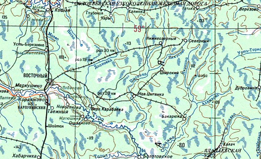 Узкоколейная железная дорога на топографической карте масштаба 1:200 000, изданной в 1986 году.