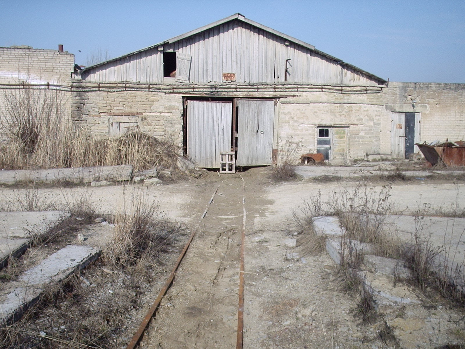 Узкоколейная железная дорога. Вид от ворот камнерезного цеха. Вдали — единственное на территории