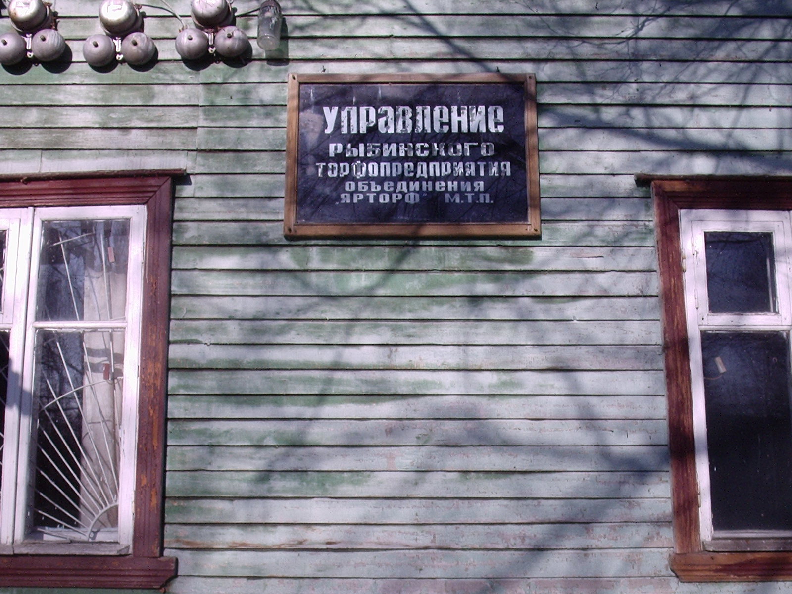 Табличка на здании бывшего управления Рыбинского торфопредприятия.