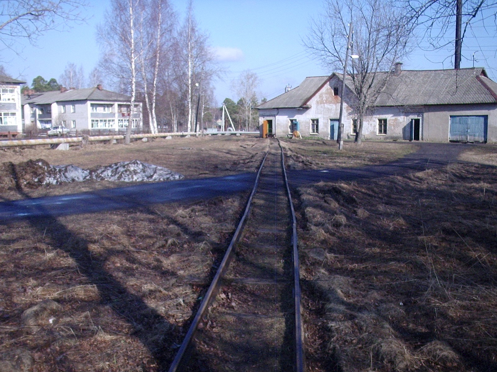Рельсовый путь узкой колеи между больницей и продовольственным магазином в посёлке Тихменево. Вид в сторону здания магазина,