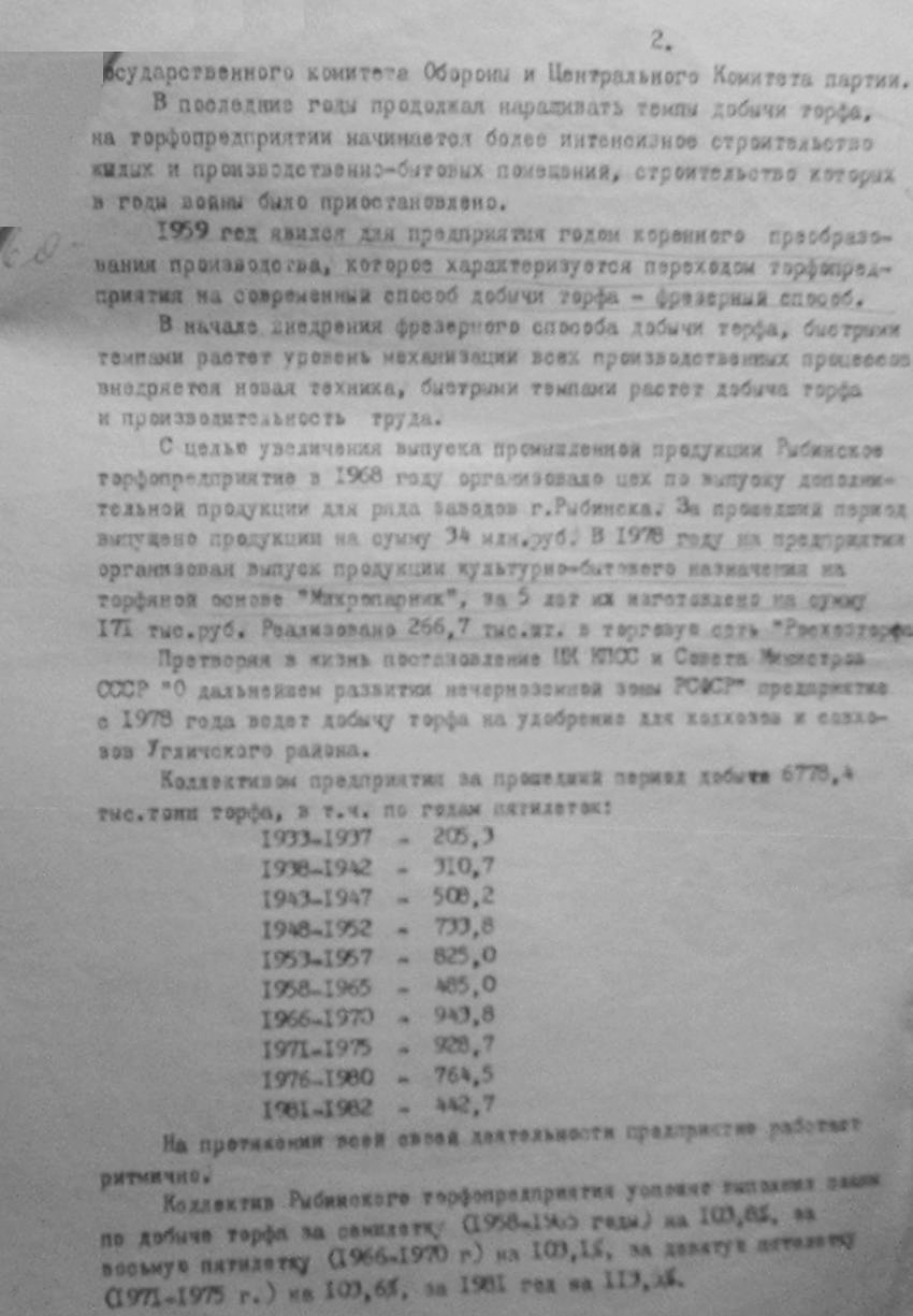 Материал об истории Рыбинского торфопредприятия (1983 год).