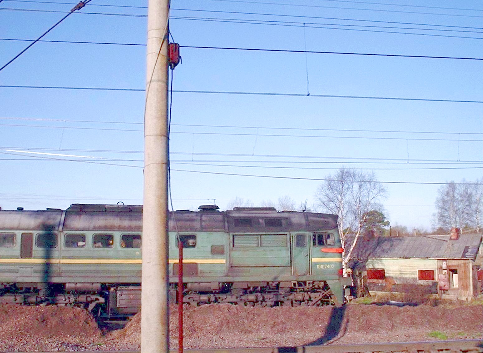 Тепловоз М62 в составе пригородного поезда, следующего со стороны Приморска.