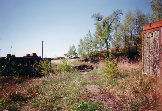 Насыпь узкоколейной железной дороги менее чем в 1 километре от Бучман. Посёлок — впереди.