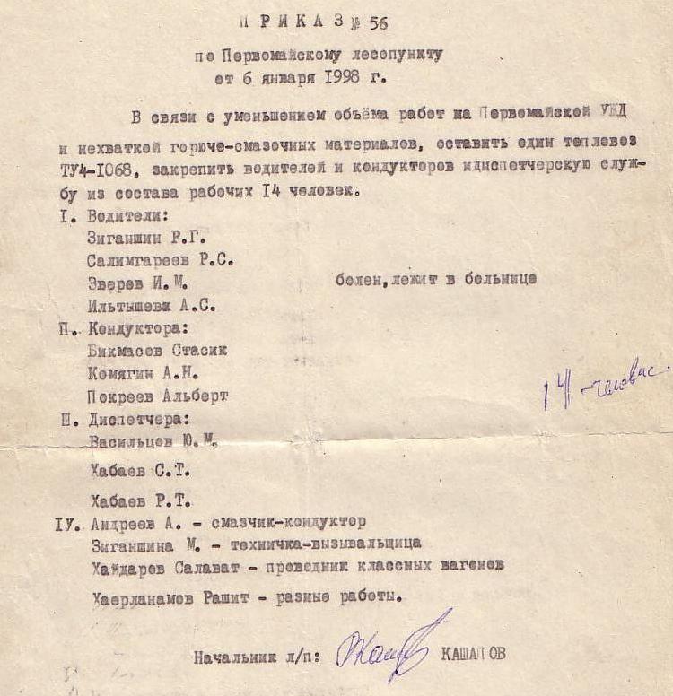 Приказ по Первомайскому лесопункту от 2 июля 1996 года,