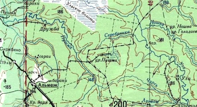 Узкоколейная железная дорога на топографической карте масштаба 1:200 000, изданной в 1968 году.