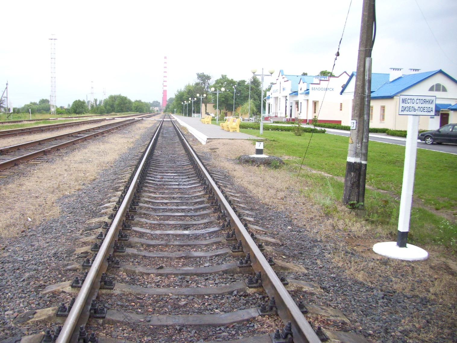 Первый путь станции Белоозёрск. Вид в южном направлении. Справа — вокзал.